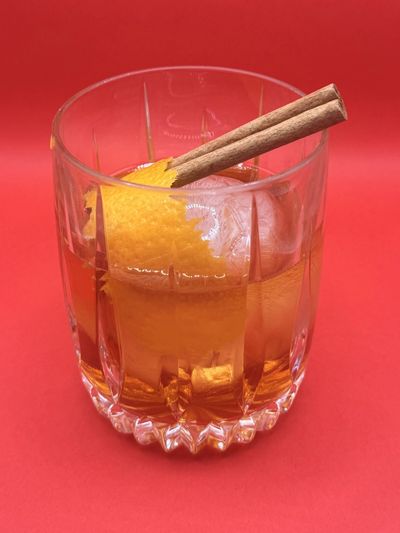 Add ingredients to an ice filled rocks glass. Stir to combine. Garnish with cinnamon stick and orange peel.
